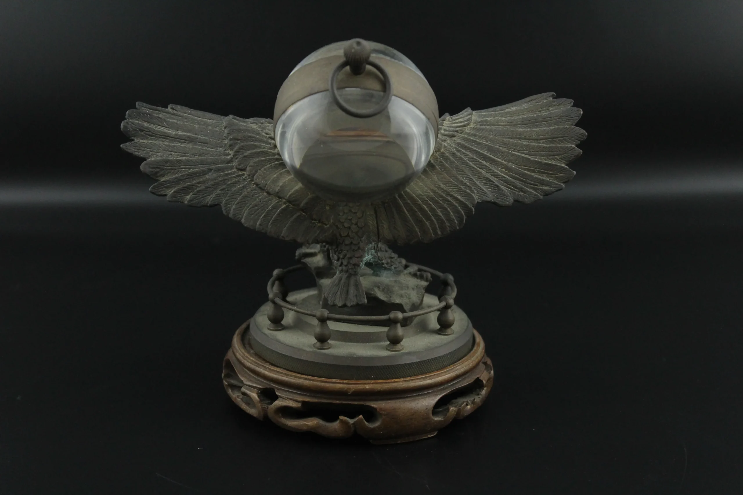 The sculpture is crafted in a classical Western style, with finely detailed feathers and a powerful eagle posture. The wings are fully extended, creating a sense of movement and dominance, while the bird stands firmly on a decorative circular base.