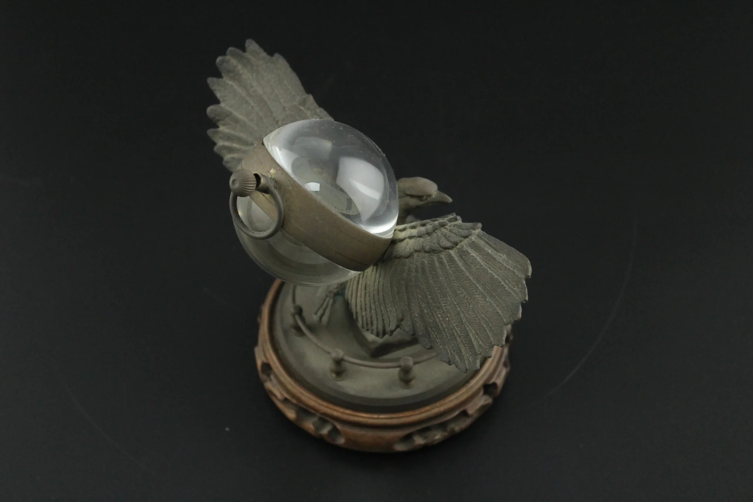 钟表部分仿古怀表造型,顶部设有表冠结构,搭配罗马数字刻度与复古指针,美观易读,古典气息浓厚。