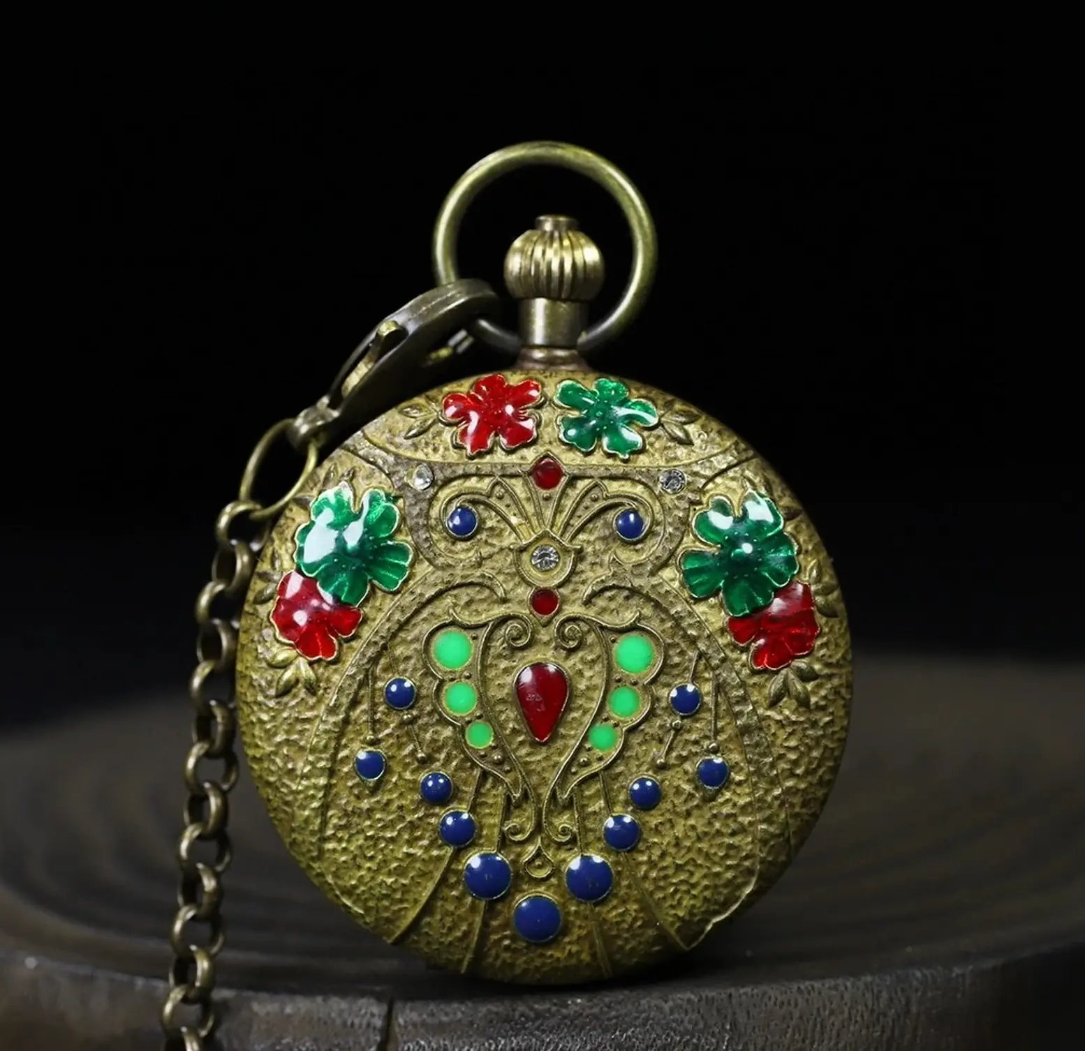 The Double Hunter structure gives it a unique sense of ceremony. Thumb lightly pushes the crown of the watch, and the front and rear covers open one after another – one side is the dazzling enamel of cloisonn é, and the other side is the precision of mechanical operation. On top of the hammered copper base, the red, green, and blue gemstone glazes outline a symmetrical peacock pattern, with rhinestones embellishing it, shining brightly even after a hundred years.