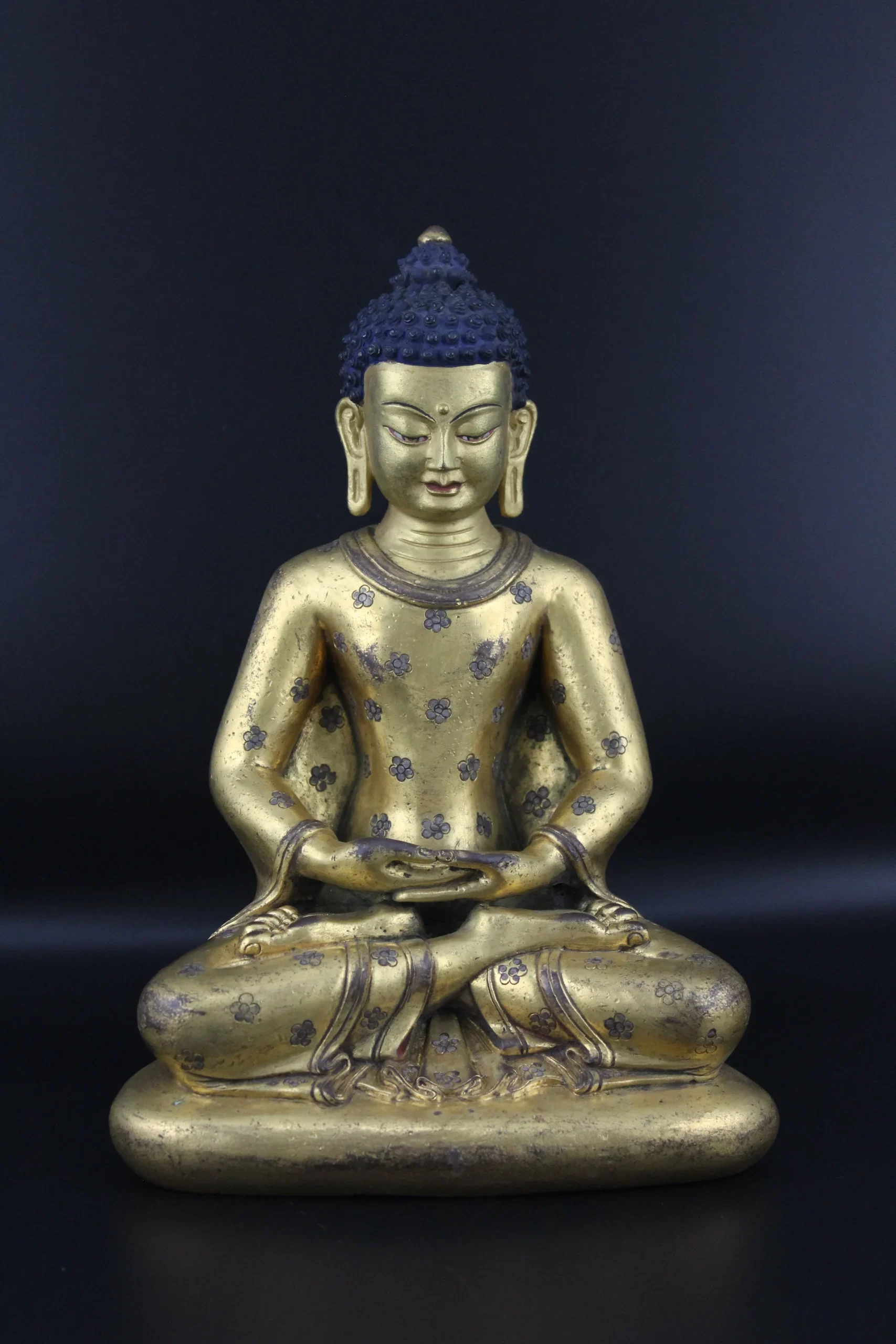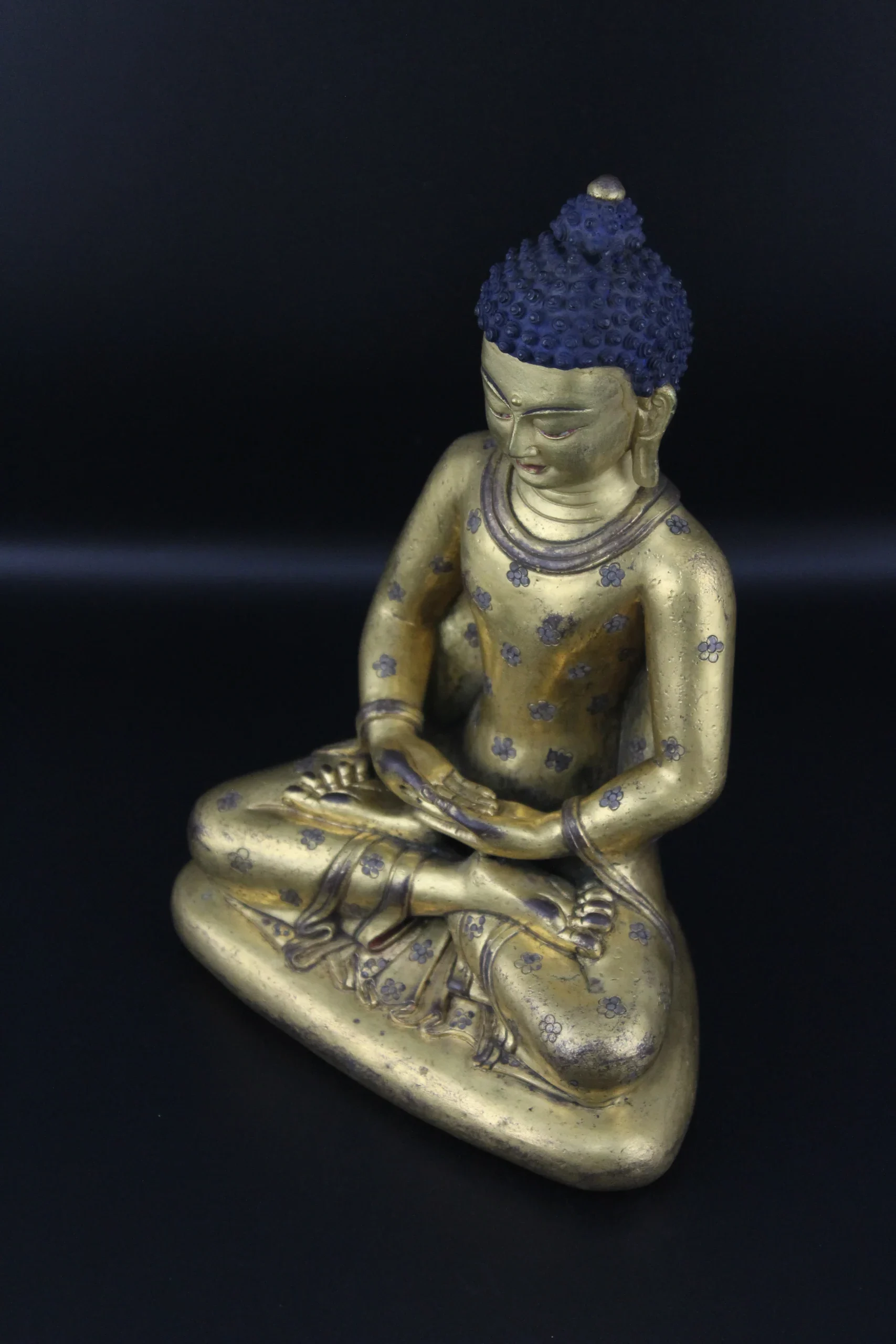This refined gilt-bronze Buddha sculpture represents Shakyamuni in a classic dhyana (meditation) posture, with hands forming the dhyana mudra, symbolizing inner peace and enlightenment.