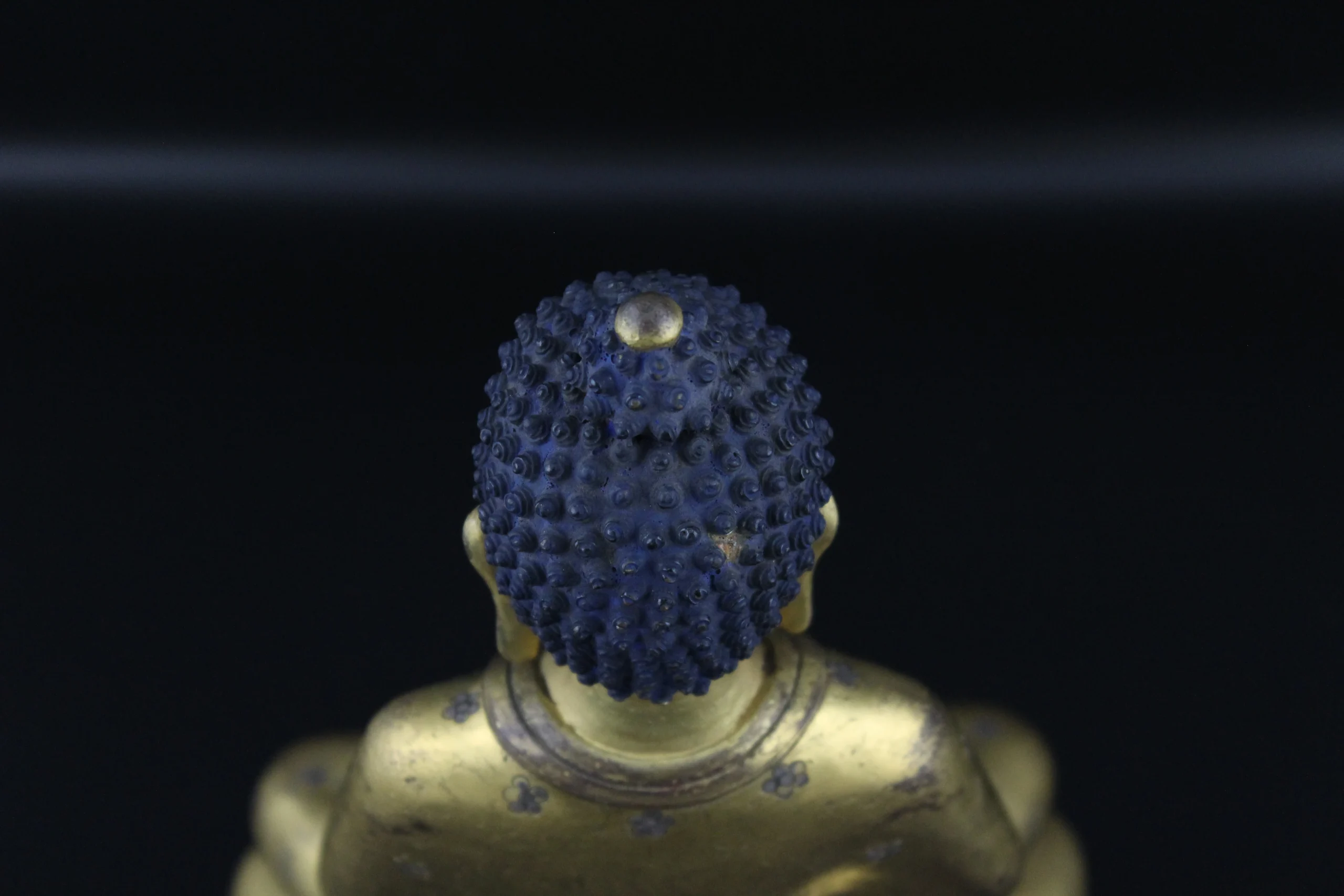 此件释迦牟尼佛像为鎏金铜质,结跏趺坐于莲座之上,双手结禅定印,神情安详宁静。螺发以蓝色彩绘点缀,通身錾刻花卉纹饰,装饰性与庄严感并存。表面自然包浆,岁月痕迹明显,极具艺术韵味与宗教气息。