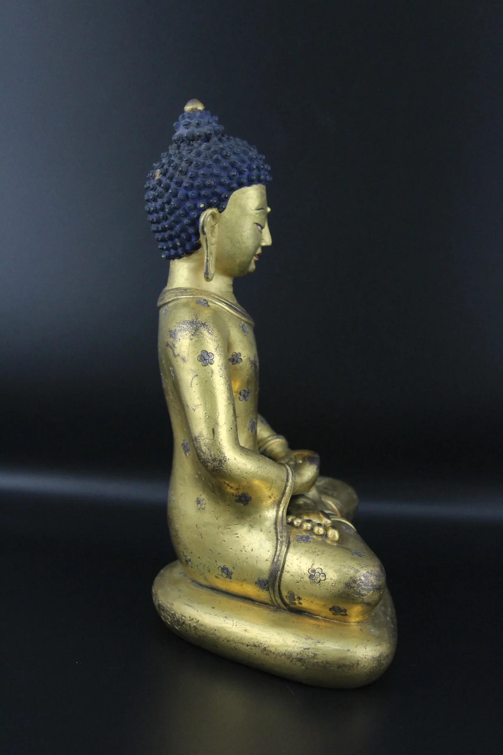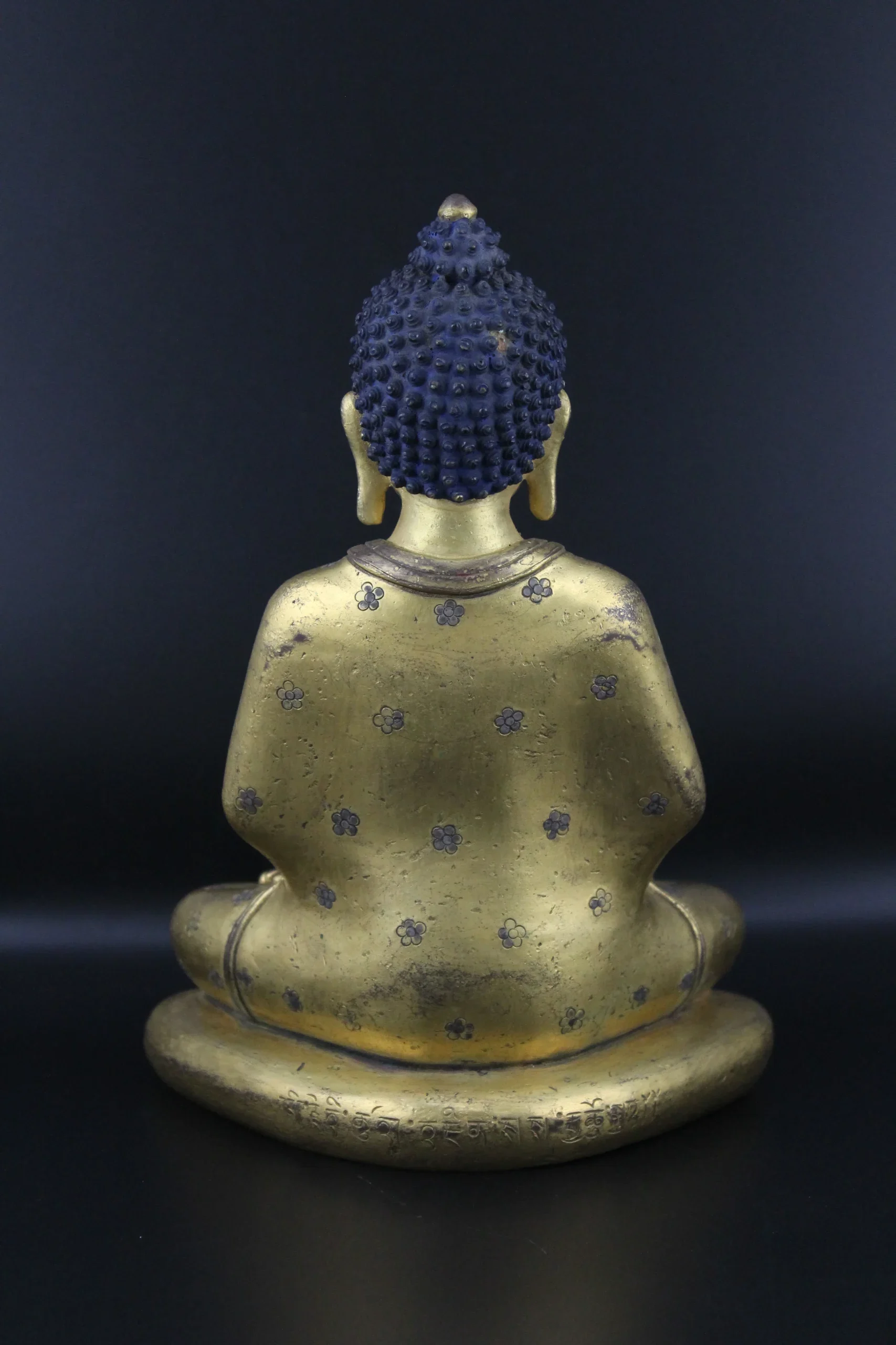 This gilt-bronze statue depicts Shakyamuni Buddha seated in serene meditation posture. The figure features a calm expression, elongated earlobes, and finely detailed hair curls highlighted in blue pigment. Floral motifs are delicately engraved across the body and robe, adding a decorative and symbolic touch. The surface shows natural aging patina, enhancing its antique aesthetic and spiritual presence.