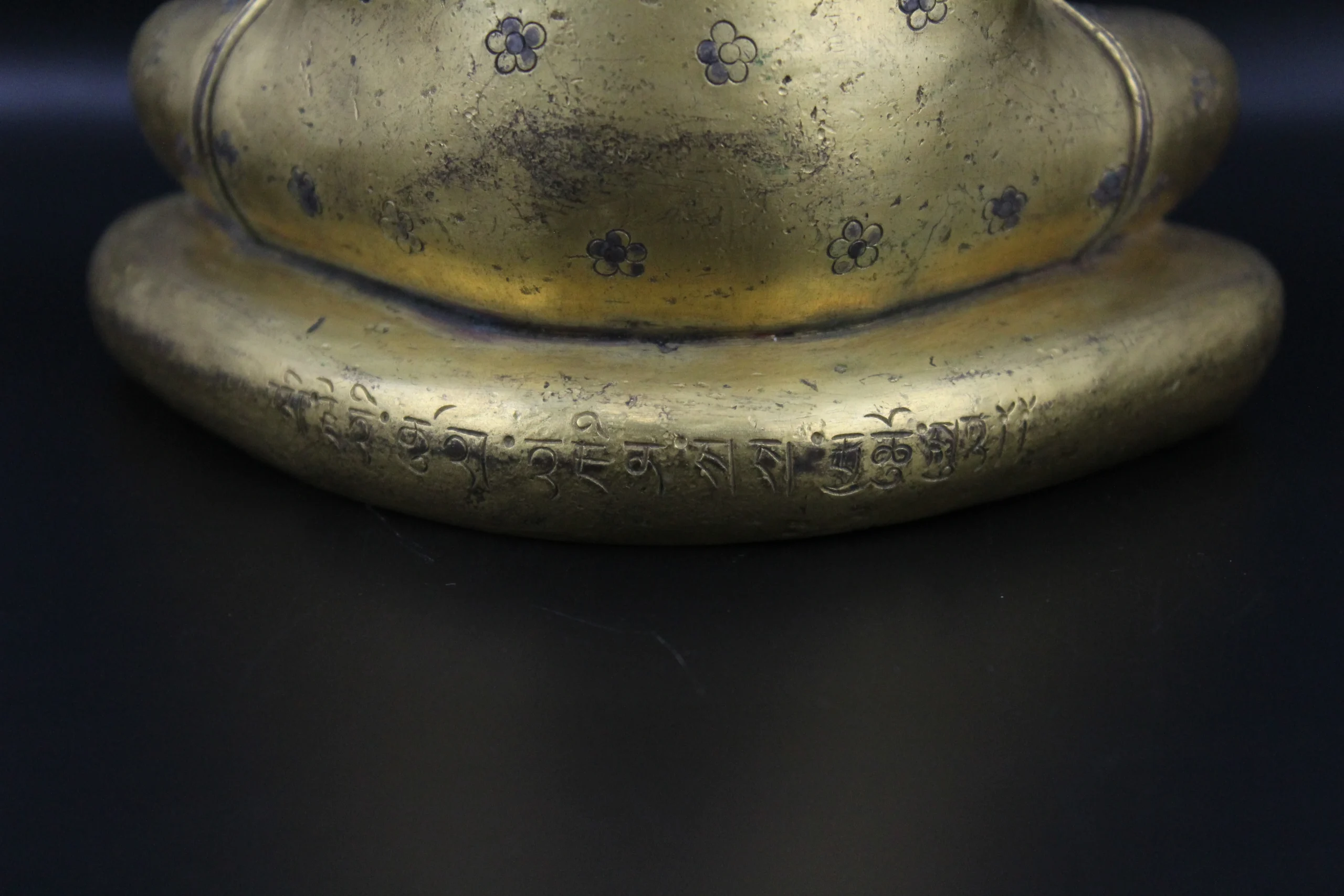 The body and robe are decorated with engraved floral patterns, evenly distributed and skillfully executed, creating a harmonious visual rhythm. The gilded surface displays a naturally aged patina, reflecting time-honored craftsmanship and adding to its historical charm.
