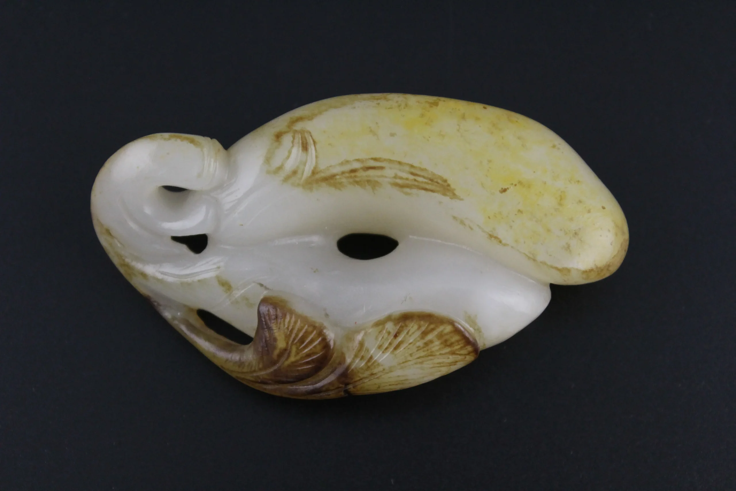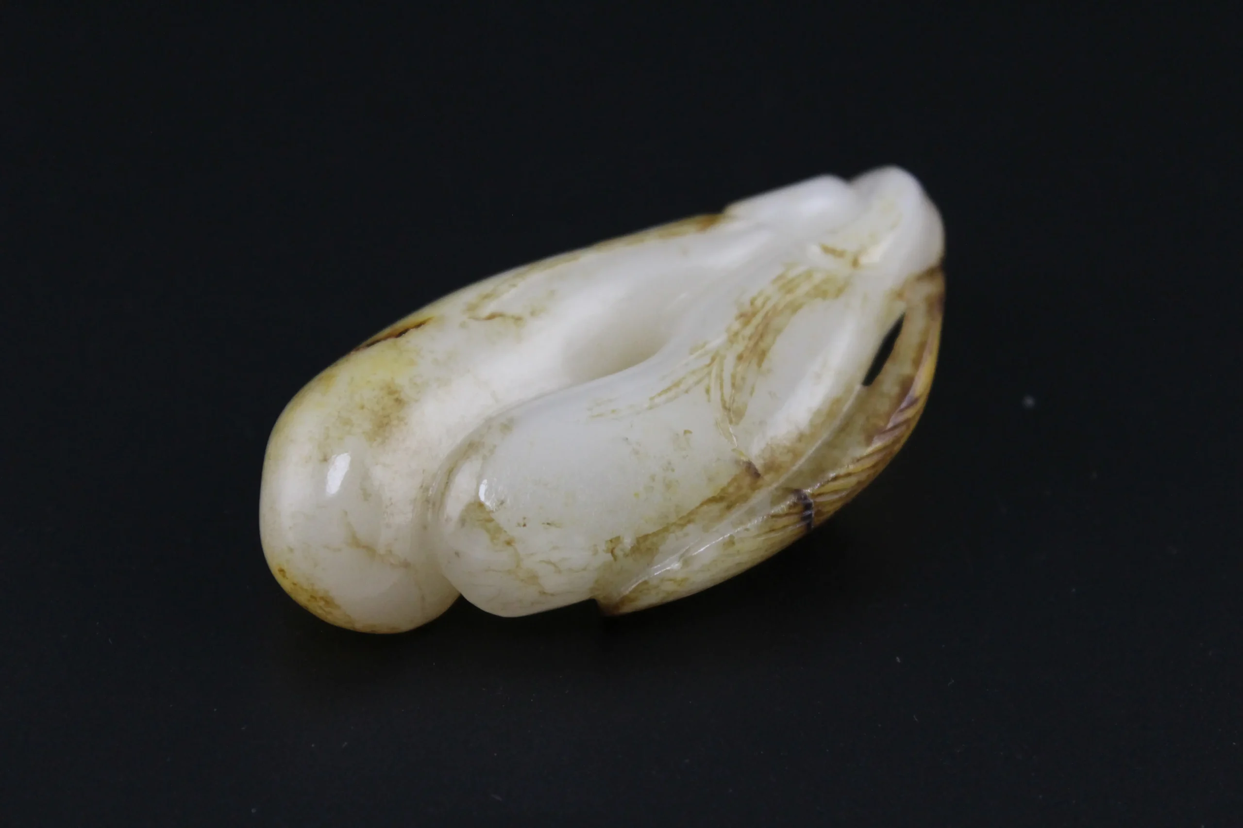 The material is primarily white jade, with a soft and delicate color. Natural patina and color variations are preserved in some areas. The craftsmanship follows the natural shape without excessive embellishment, making the piece appear more natural and lifelike. The patina is distributed on the fruit and edges.
